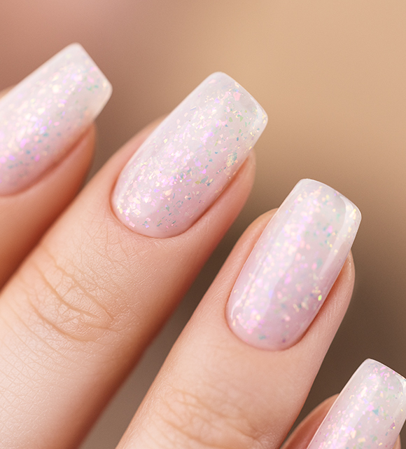 Kühle, milchig-weiße Hybrid-Basis mit schimmerndem Akzent, mit Folienstücken in Rosa- und Lila-Tönen