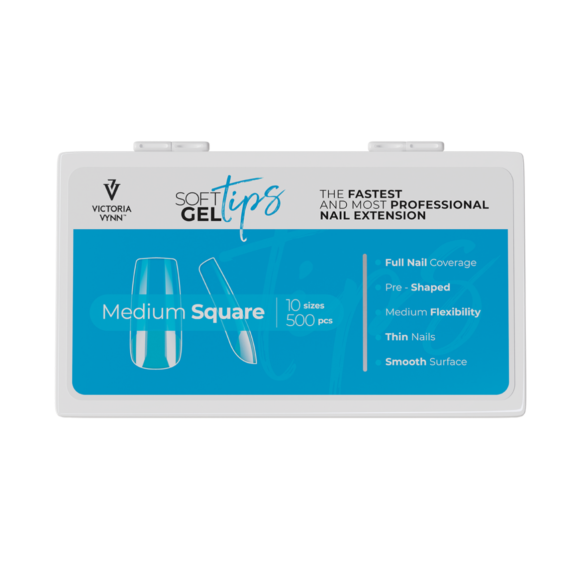 Medium Square – vorgeformte, leicht satinierte Acryl-Tips. Zeichnen sich durch eine sehr einfache Anwendung und natürlich aussehende Nagelverlängerung aus. Die Packung enthält die Größen 0 bis 9. Die Nageltips sind in einer speziellen Kartonschachtel verpackt.