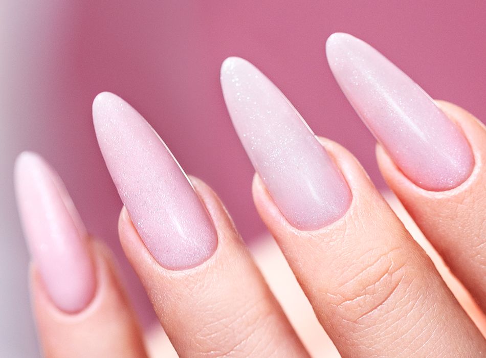 Erlebe den Glanz von schimmernden Partikeln mit unserem Aufbau-Gel in zartem Rosé!
